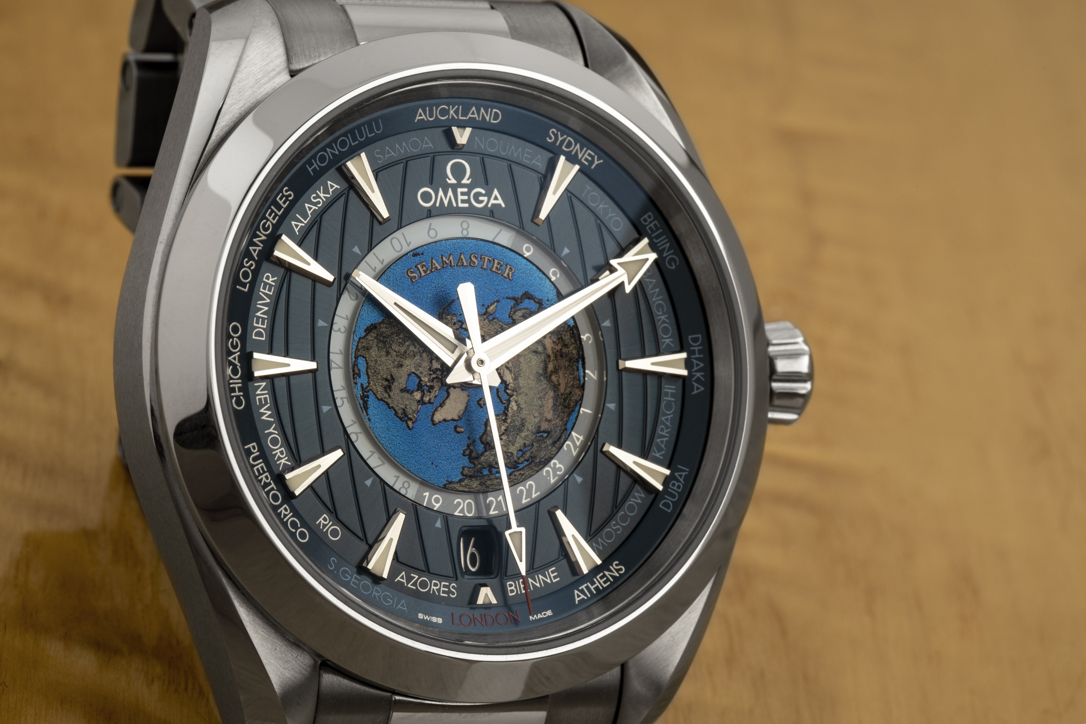 Omega Seamaster Aqua Terra 150M Co-Axial Master Chronometer GMT Worldtimer 43 mm watch. Model reference: [insert model reference]. Stainless steel case with polished and brushed finish. Blue dial with vertical “teak” pattern and world map in relief at the center. Automatic movement with GMT and World Time functions. Stainless steel bracelet with folding clasp. Swiss made. The watch comes in the original packaging, with a set of documents and 5 years warranty. At The Timekeepers, we offer new authentic watches at the best prices.